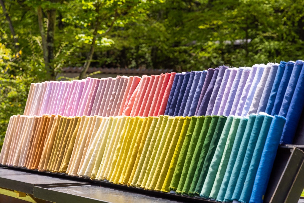 色とりどりの布は、長野県内で収穫された自然の素材で染色されました。春を告げるダンコウバイの黄色から、可憐なツツジ夏の森に咲くレンゲショウマの淡い紫まで、軽井沢の草花の物語を宿した布がグラデーションを作ります。昨年も飾った布を染め直すことで、深みが増し、より柔らかな風合いになりました。