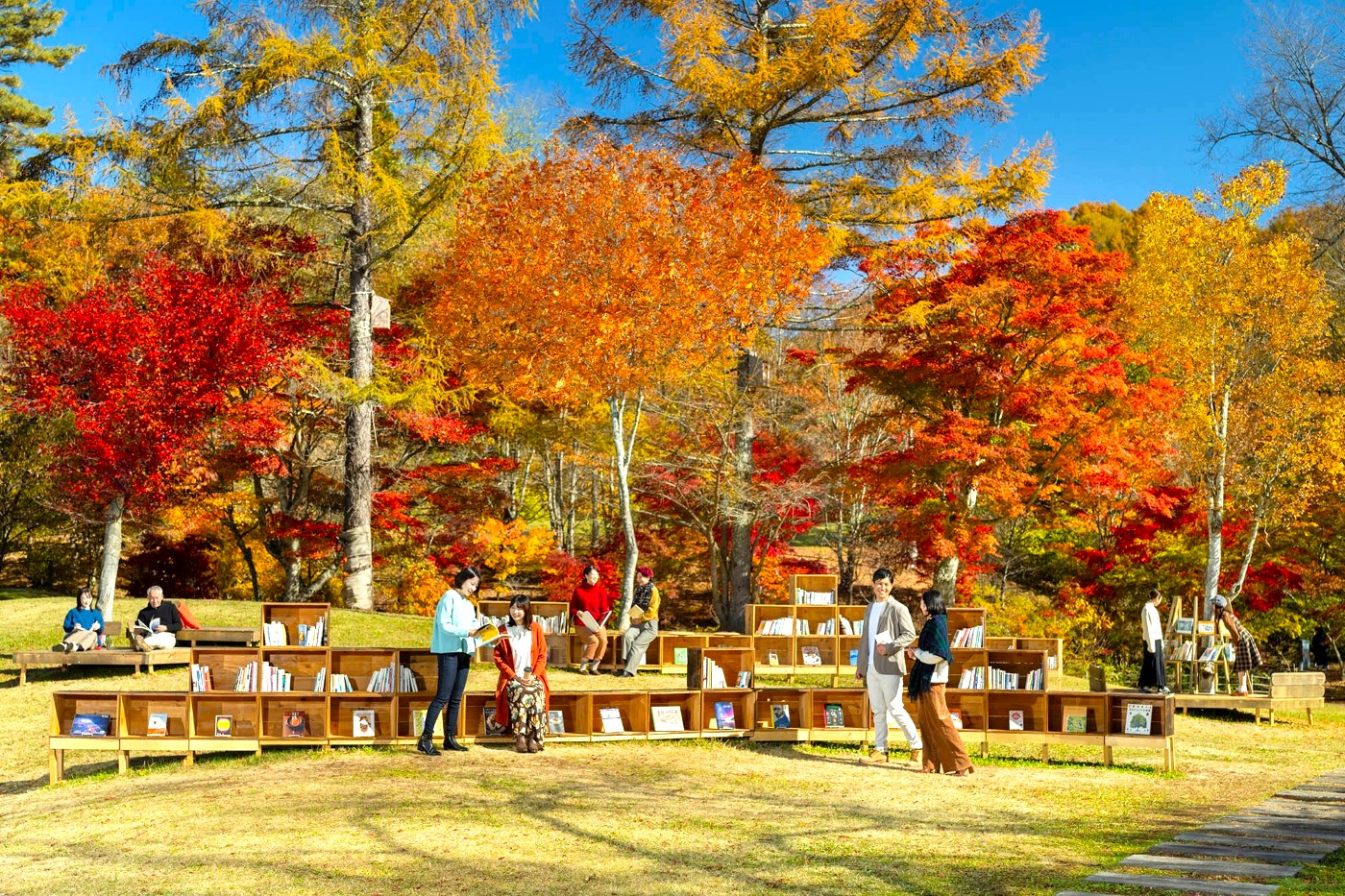 紅葉と読書の秋を満喫するイベント。モミジやカラマツで彩られた広場に、期間限定のベンチ&本棚が登場。秋をテーマにした本が600冊並ぶ。絵本とクッションを設えたコーナーもあり、親子でも読書できる。期間中の土日祝日には小さな本屋さんも出店。読まなくなった本を集めた本棚もあり、気に入った本があれば持ち帰れる「本のリレー」も開催する。