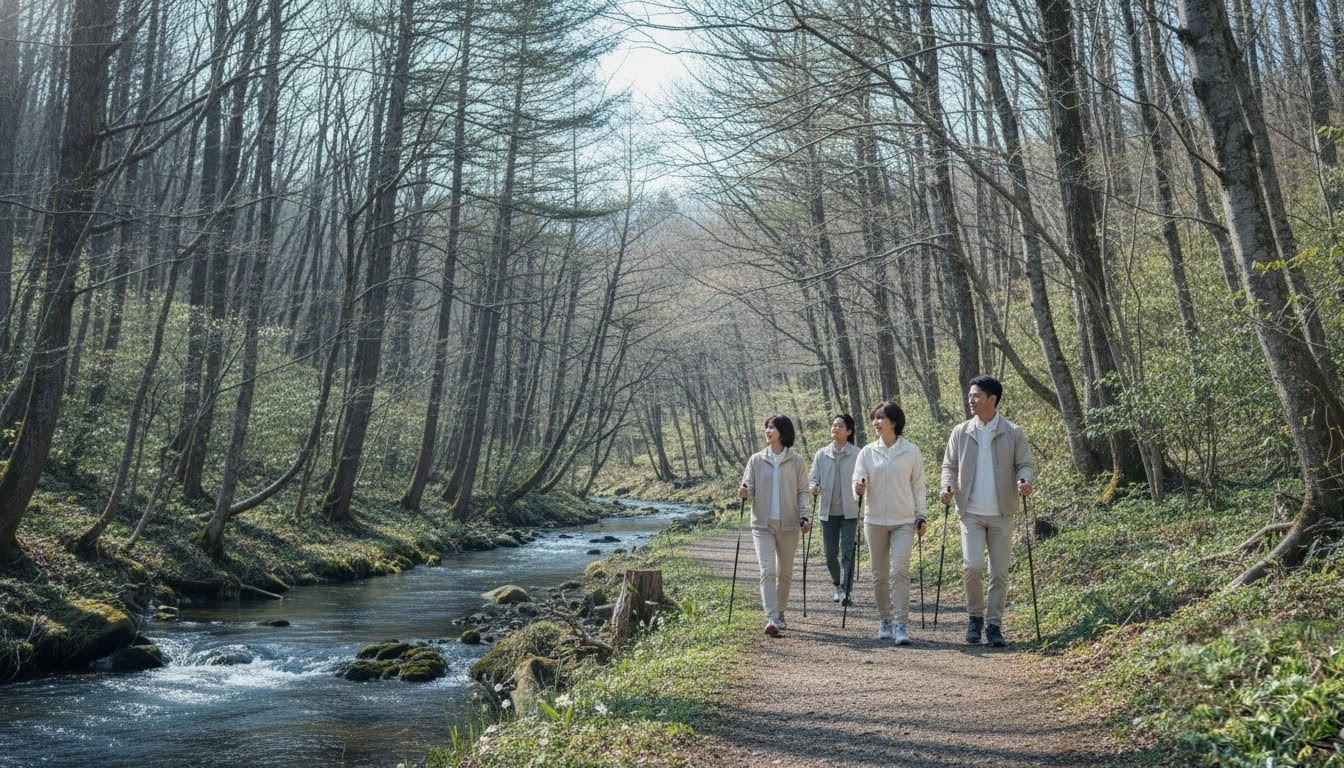 軽井沢・星野エリアで開催される「目覚めのノルディックウォーキング」は、春の森を感じながら気軽に参加できるウォーキングイベントです。