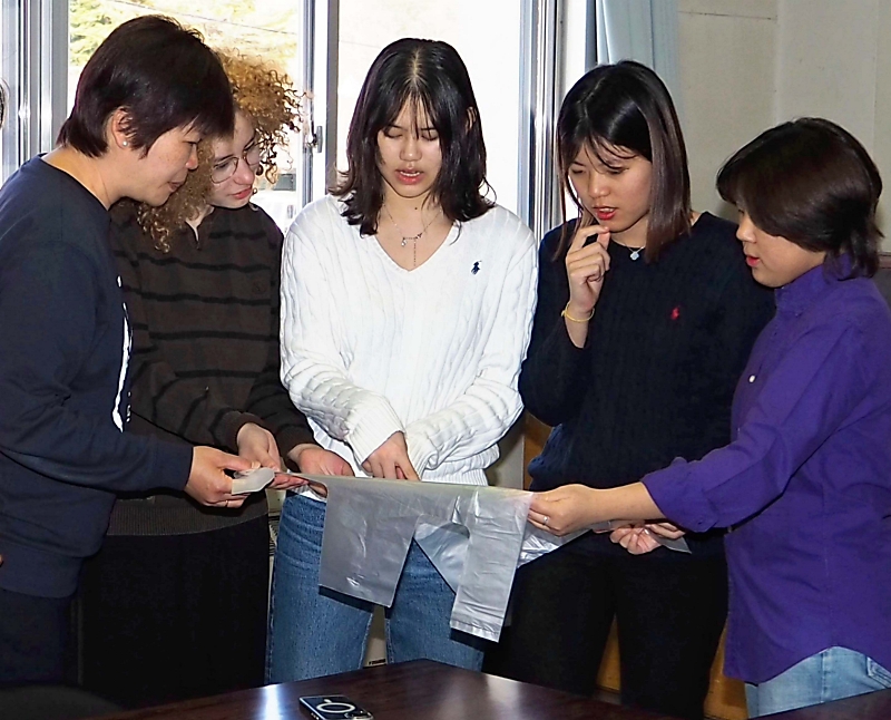 11日は生徒4人を含む6人が町役場を訪問し、土屋三千夫町長からごみ袋を受け取った。袋に顔を近づけると「うっすらお米のにおいがする」と生徒たち。製造費は袋1枚当たり約35円で従来品(約25円)より割高だ。グループリーダーの三浦百音(ももね)さん(17)は「コスト面の課題について製造会社の方と話をするなどして、どう乗り越えるか考えていきたい」と話した。