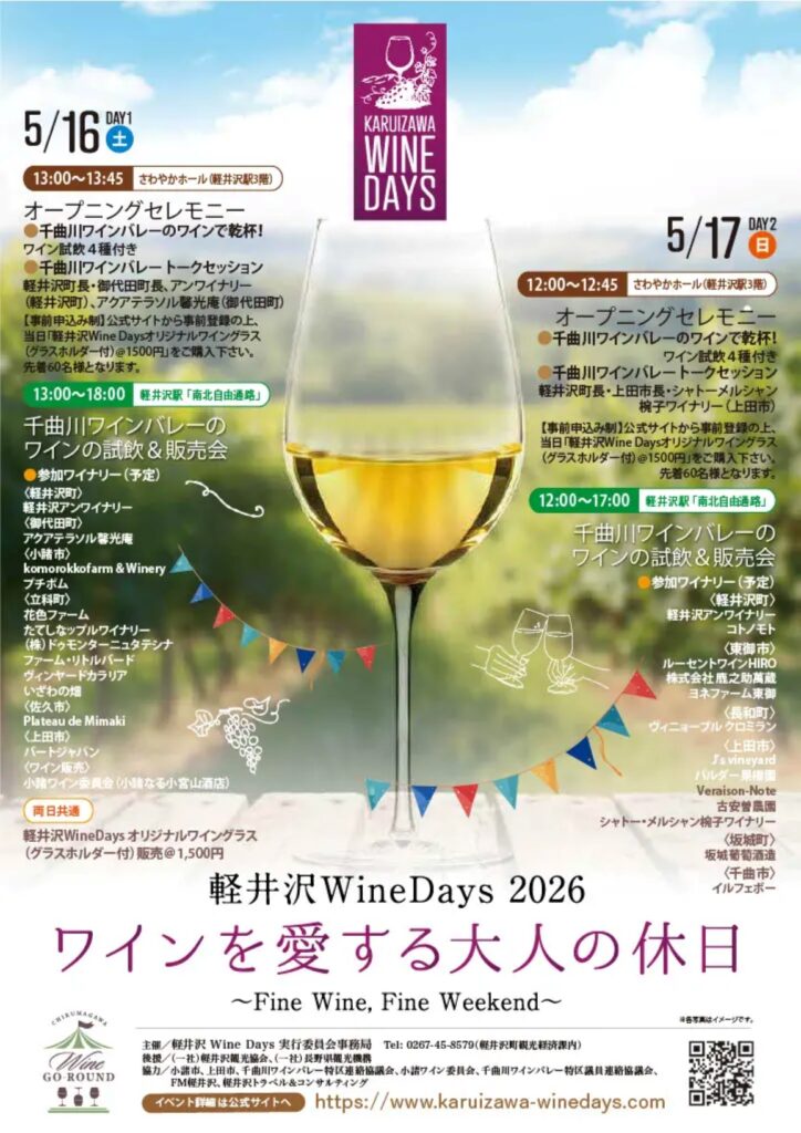 軽井沢Wine Day2026(5/16〜17)は、信州を代表する千曲川ワインバレーのワイナリーが集結し、試飲や販売を楽しめる“大人のための贅沢なイベント”。新緑の軽井沢で、造り手の想いに触れながらお気に入りの一本を見つける特別な時間が魅力です。