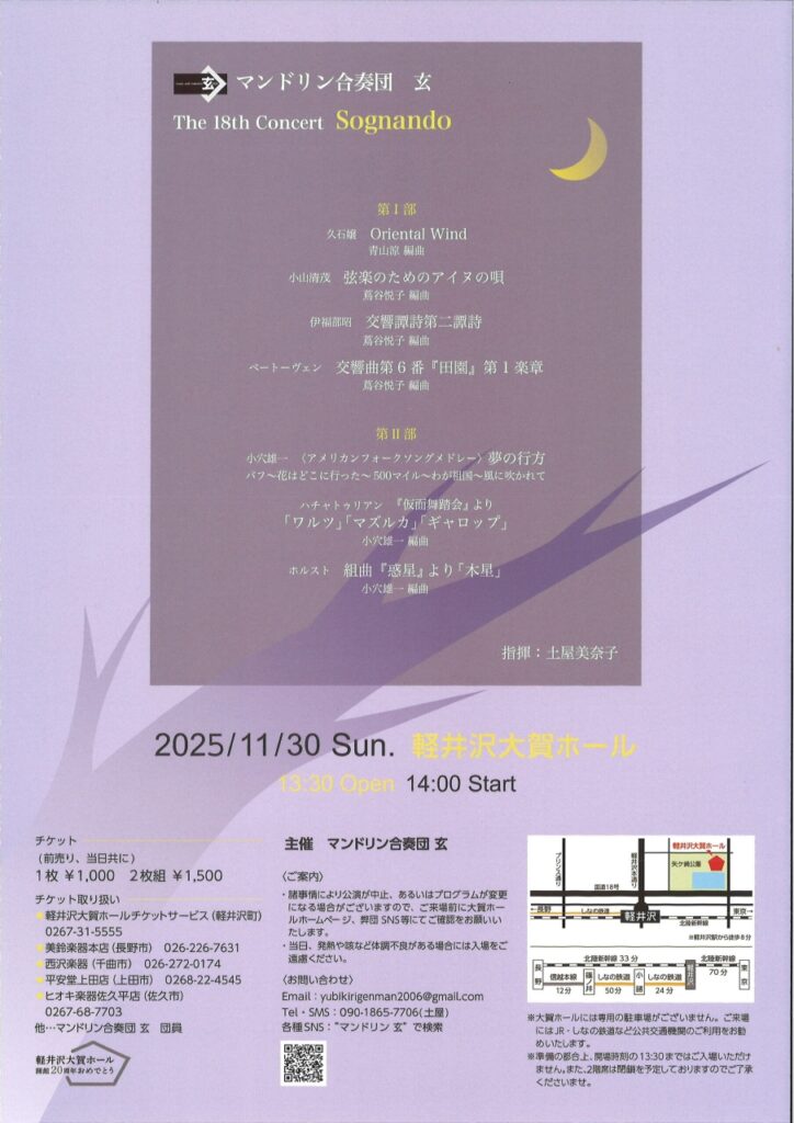 マンドリン合奏団 玄の第18回演奏会「Sognando」は、11月30日(日)に軽井沢大賀ホールで開催されます。