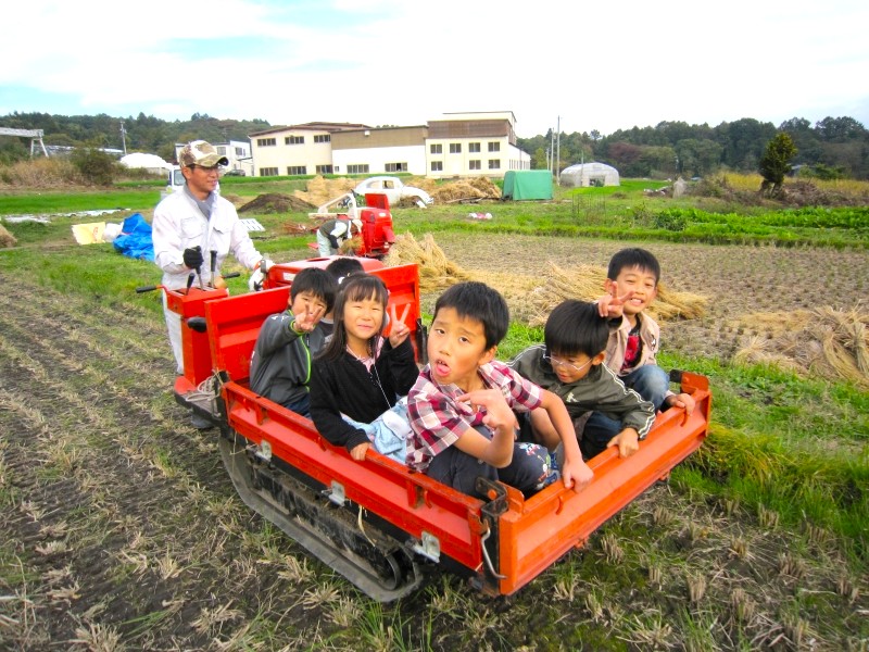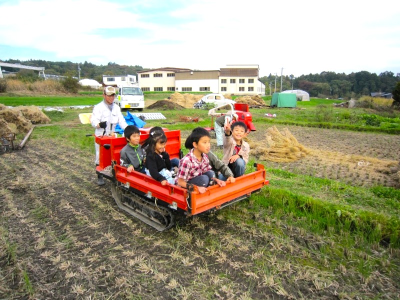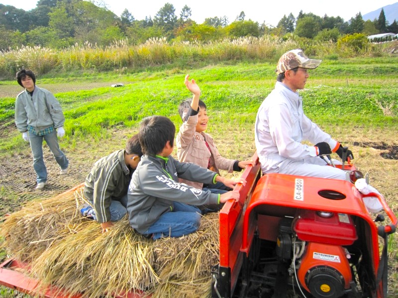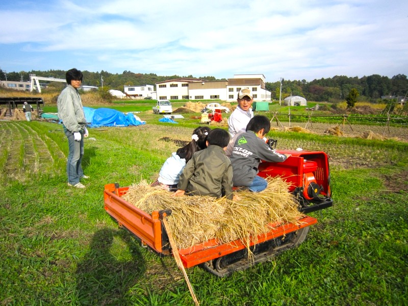 こどもたちは、わらを運ぶ車がお気に入り。