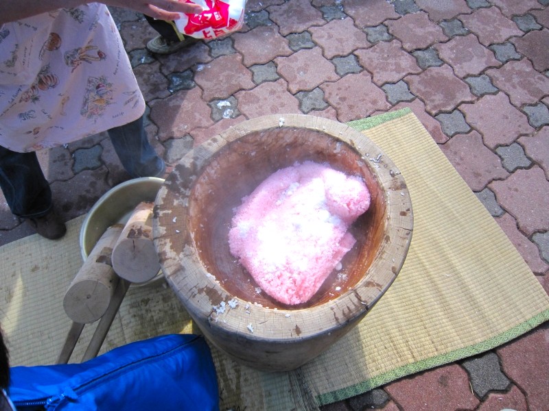 臼の中へ。いよいよ、もちつきのはじまりです。