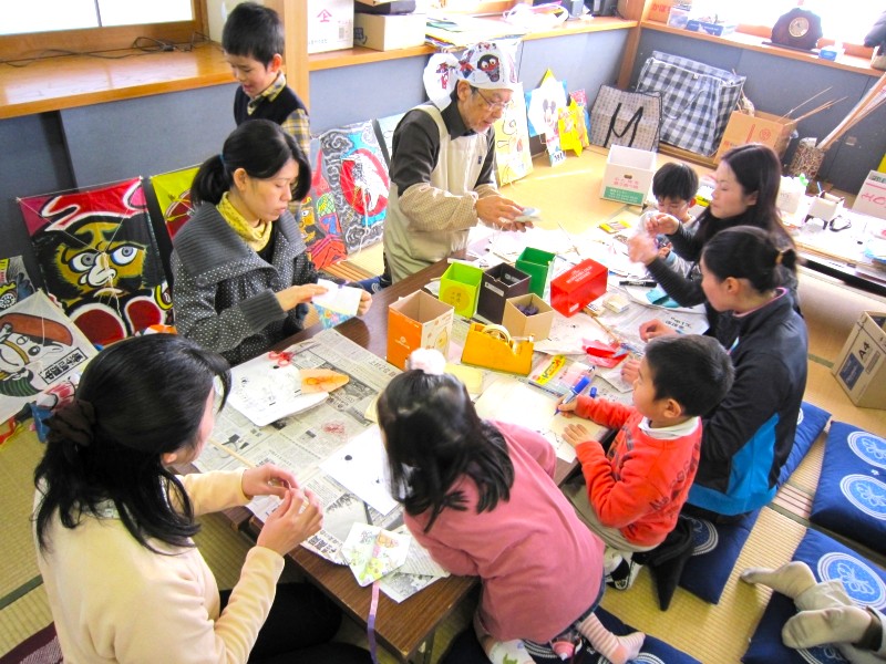 保育園児は折り紙凧づくり、小学生は角凧づくりに挑戦。親子・先生が協力し合う、あたたかい時間が流れました。