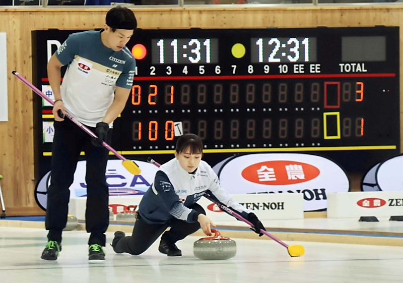 カーリングの日本混合ダブルス選手権最終日は3日、北佐久郡軽井沢町の軽井沢アイスパークで行われ、決勝は上野美優と山口剛史が組んだSC軽井沢小野寺佳歩、前田拓海組を10-5で快勝し、初優勝した。