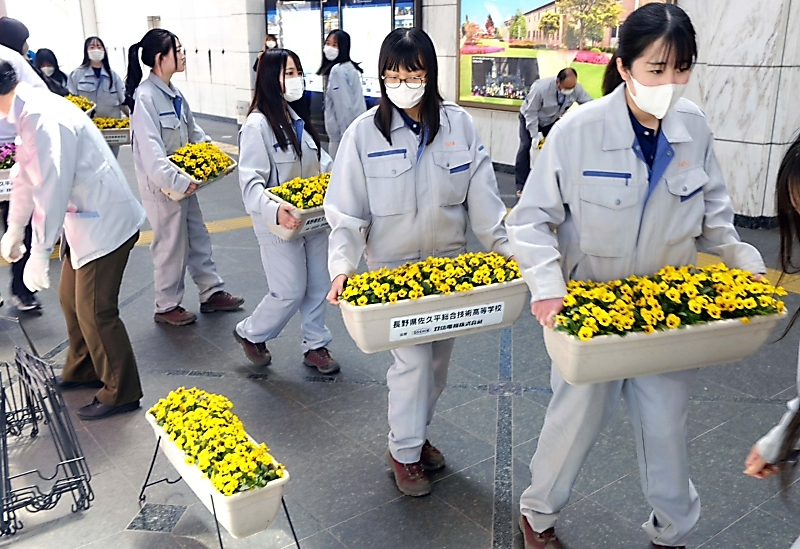 佐久市の佐久平総合技術高校生物サービス科植物活用コースの生徒13人と市観光協会などが3日、市花のコスモスを植えたプランター約40個を同市のJR佐久平駅の通路に飾り付けた。生徒たちが育てたコスモスは…
