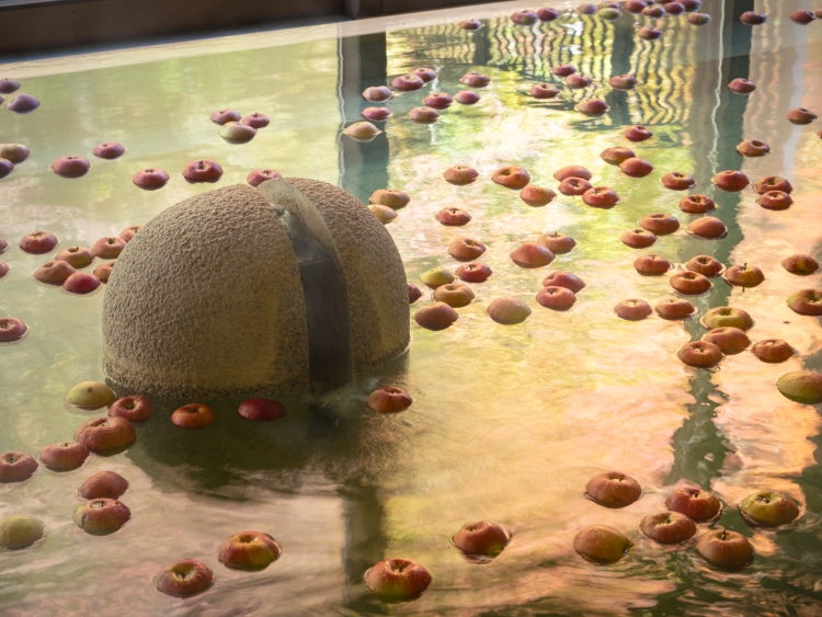 トンボの湯の「りんご湯」では、湯船いっぱいのりんごが放つ香りに包まれ、身も心も温まる癒やしのひとときを堪能。