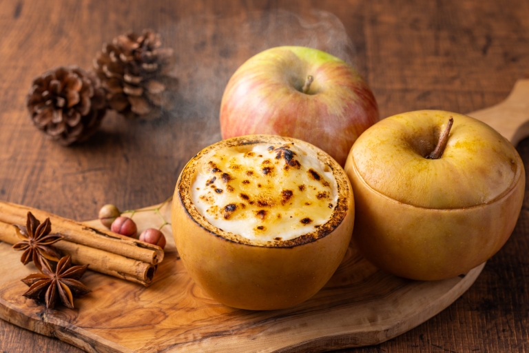 特設のりんごテントの中で、りんごの温かいスイーツが味わえます。りんごを丸ごと使用した「まるごとりんごグラタン」、りんごや栗、さつまいもをのせたそば粉の小さなパンケーキ「秋の味覚たっぷりのブリニ」どちらも薪ストーブの上で温めて、お召し上がりいただきます。